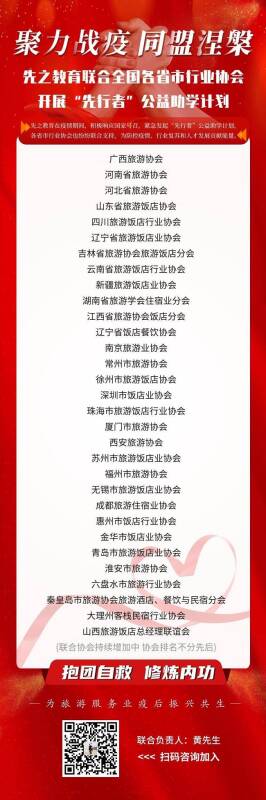 为推动旅游服务业在逆境中的振兴,增强和提高行业人才的学习力,旅游服务业在线教育领导品牌-先之教育,联合31家旅游饭店协会(名单持续更新中)开展"先行者"公益助学计划。