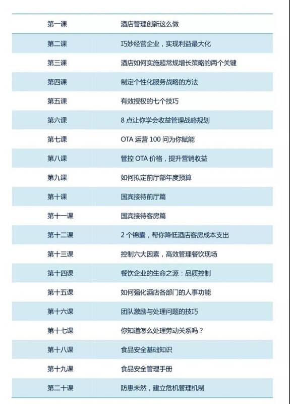 同时先之教育联合各省市旅游饭店协会为当地企业开通线上免费视频课程及公益直播系列课。课程汇聚行业专家讲师,以实战为导向为酒店业量身制定,通过"运营管理20课"和"职场晋升必修30课",针对不同岗位进行全面培训,实现从基层员工到总经理岗位所需知识体系全覆盖,为疫情过后的市场重启做好准备。