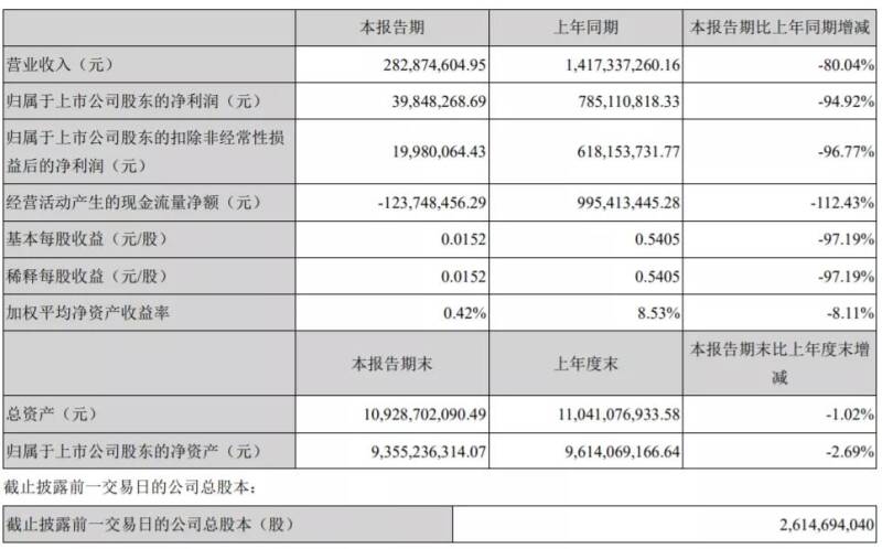 财报显示,2020年上半年,宋城演艺实现营业收入2.83亿元,同比下降80.04%;实现归母净利润0.4亿元,同比下降94.92%;实现扣非后归母净利润0.20亿元,同比下降96.77%。